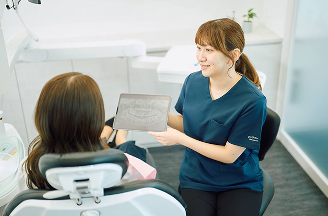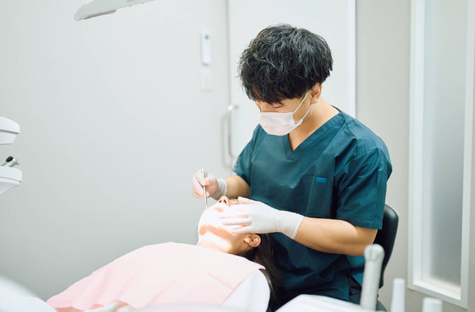 まず担当の歯科衛生士が、歯石除去、バイオフィルム除去、歯面清掃などを丁寧に行い、お口全体を清潔な状態へ整えます。その後、歯科医師が歯ぐきの状態や虫歯の有無、噛み合わせの変化などを細かく確認し、必要に応じて追加の処置や今後のケア方針をご説明します。