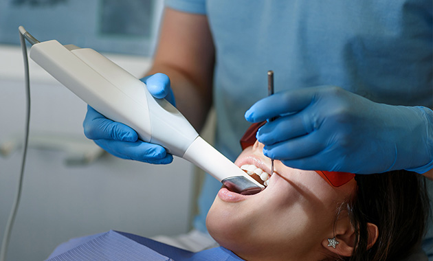 当院では、粘土状の印象材をお口に入れて型採りをする方法ではなく、口腔内スキャナーを使用してデータを取得します。スキャナーは小型で、スキャンは短時間で完了し、嘔吐反射が出やすい方でも負担が少ない歯型採得が可能です。