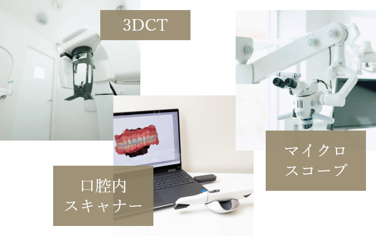 当院では、精密な診療に欠かせないマイクロスコープや3DCT、口腔内スキャナーなどの医療機器を導入しており、より正確な診査・診断と、負担の少ない治療につなげるための設備環境を整えています。