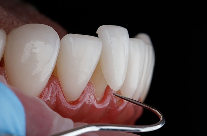 歯の表面を薄く削り、セラミックのシェルを貼り付ける治療法です。ネイルチップのように、気になる部分を手早く整えられるのが特長です。前歯の色や形、すき間が気になる方におすすめです。