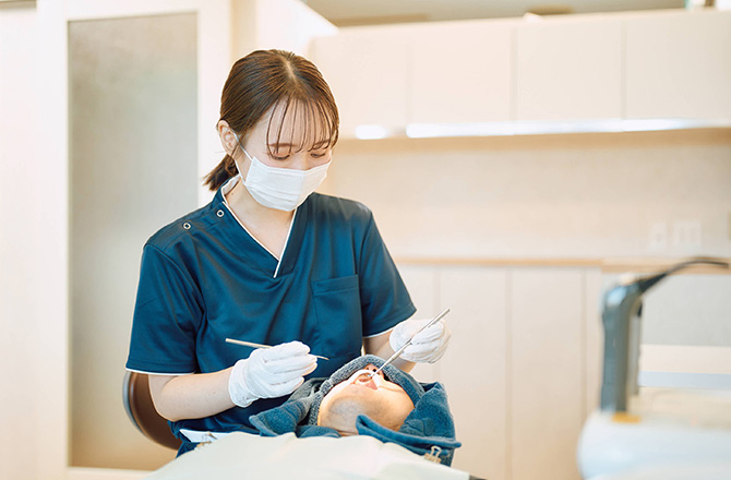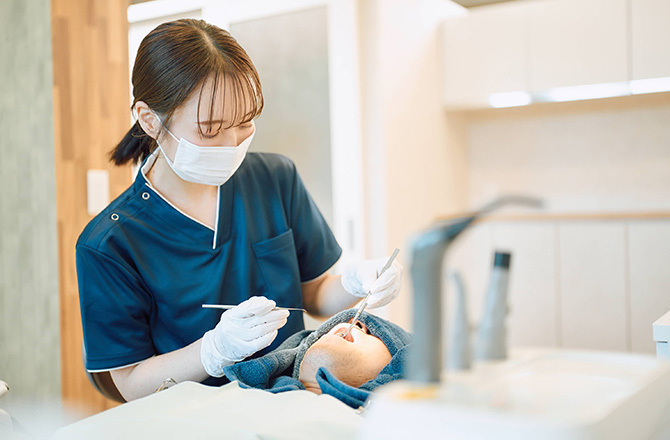 まず担当の歯科衛生士が、歯石除去、バイオフィルム除去、歯面清掃などを丁寧に行い、お口全体を清潔な状態へ整えます。その後、歯科医師が歯ぐきの状態や虫歯の有無、噛み合わせの変化などを細かく確認し、必要に応じて追加の処置や今後のケア方針をご説明します。